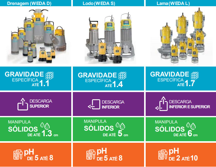 Entendemos as necessidades de drenagem de nossos clientes, que variam de acordo com a localização e a aplicação. Assim, nossa linha submersível é desenvolvida para aplicações de drenagem (D), lodo (S) e lama (L).